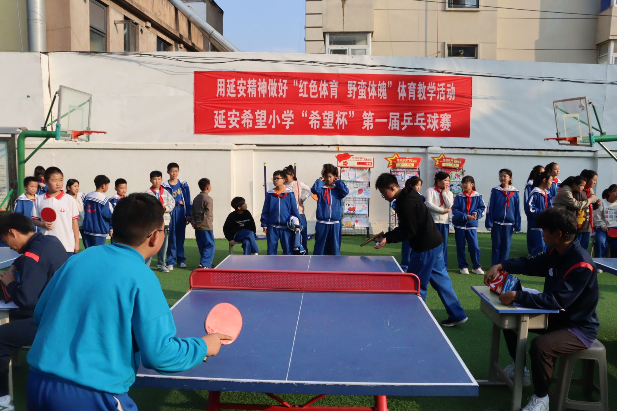 随后,延安希望小学“希望杯”第一届乒乓球比赛展开,“薪火”党员志愿服务队成员认真做好比赛裁判服务工作,为比赛的有序进行提供了有力保障,活动现场教师与学生精彩互动,活动氛围融洽而又热烈。