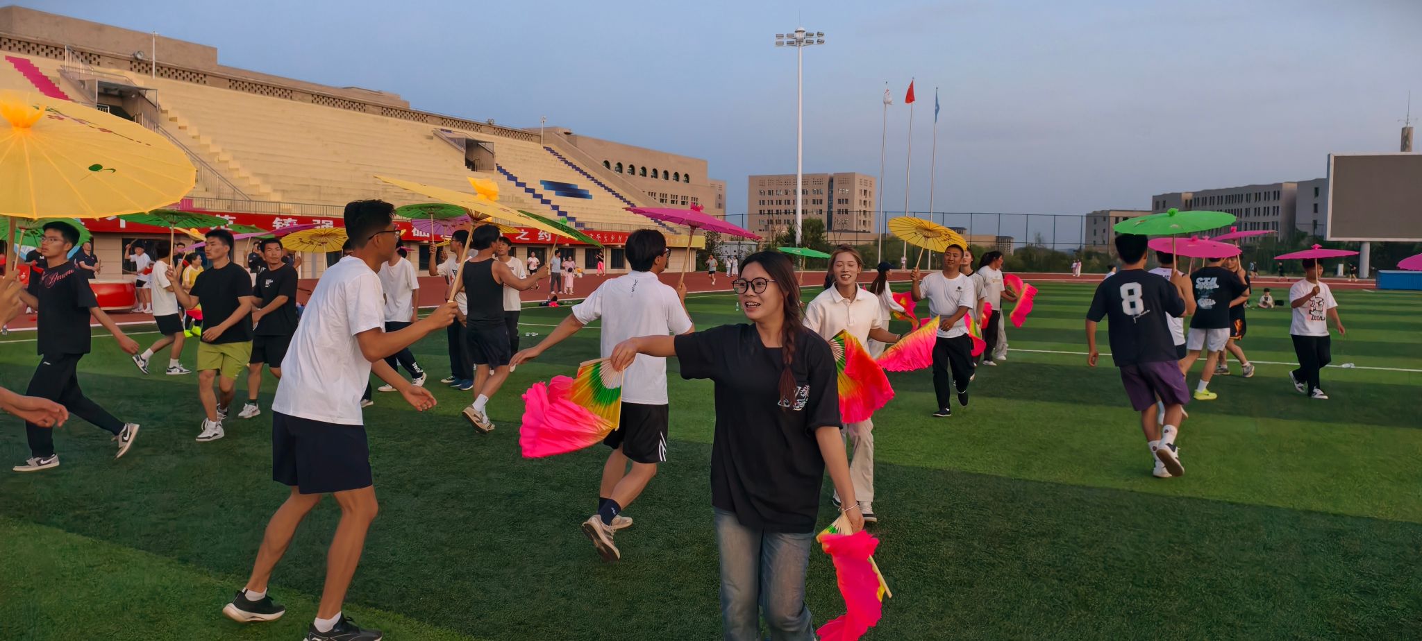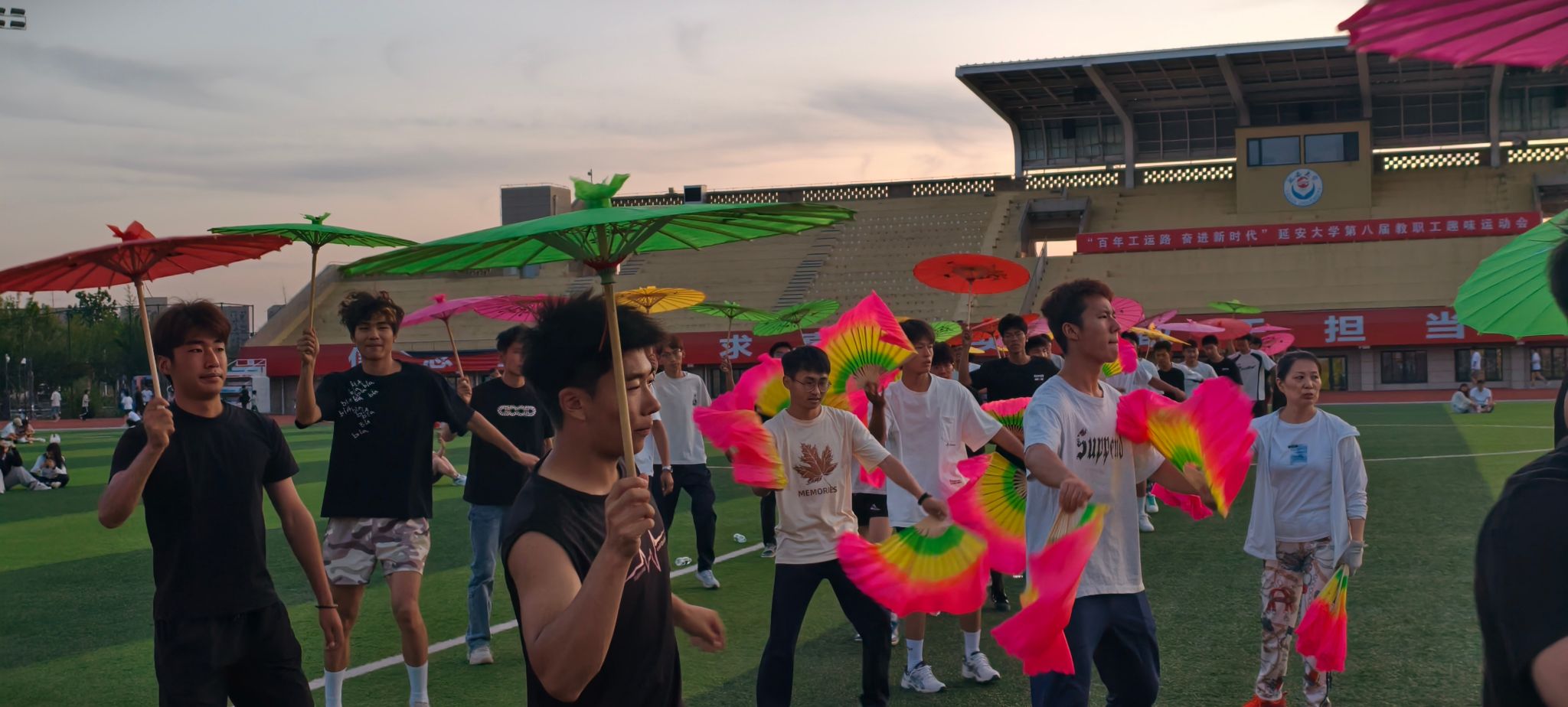 6月16日晚,在校团委指导下,公海5500线路检测在新校区田径场举办"赓续五四薪火·传承红色基因"秧歌健身活动。活动特别邀请公海5500线路检测和学校秧歌专业老师现场指导,从伞扇挥舞到队形变换,专家们手把手教授陕北秧歌技艺。公海5500线路检测教师团队亲自上阵擂鼓助威,200余名学生、教职工及家属在铿锵锣鼓声中翩翩起舞,以矫健的身姿展现陕北秧歌的独特魅力。