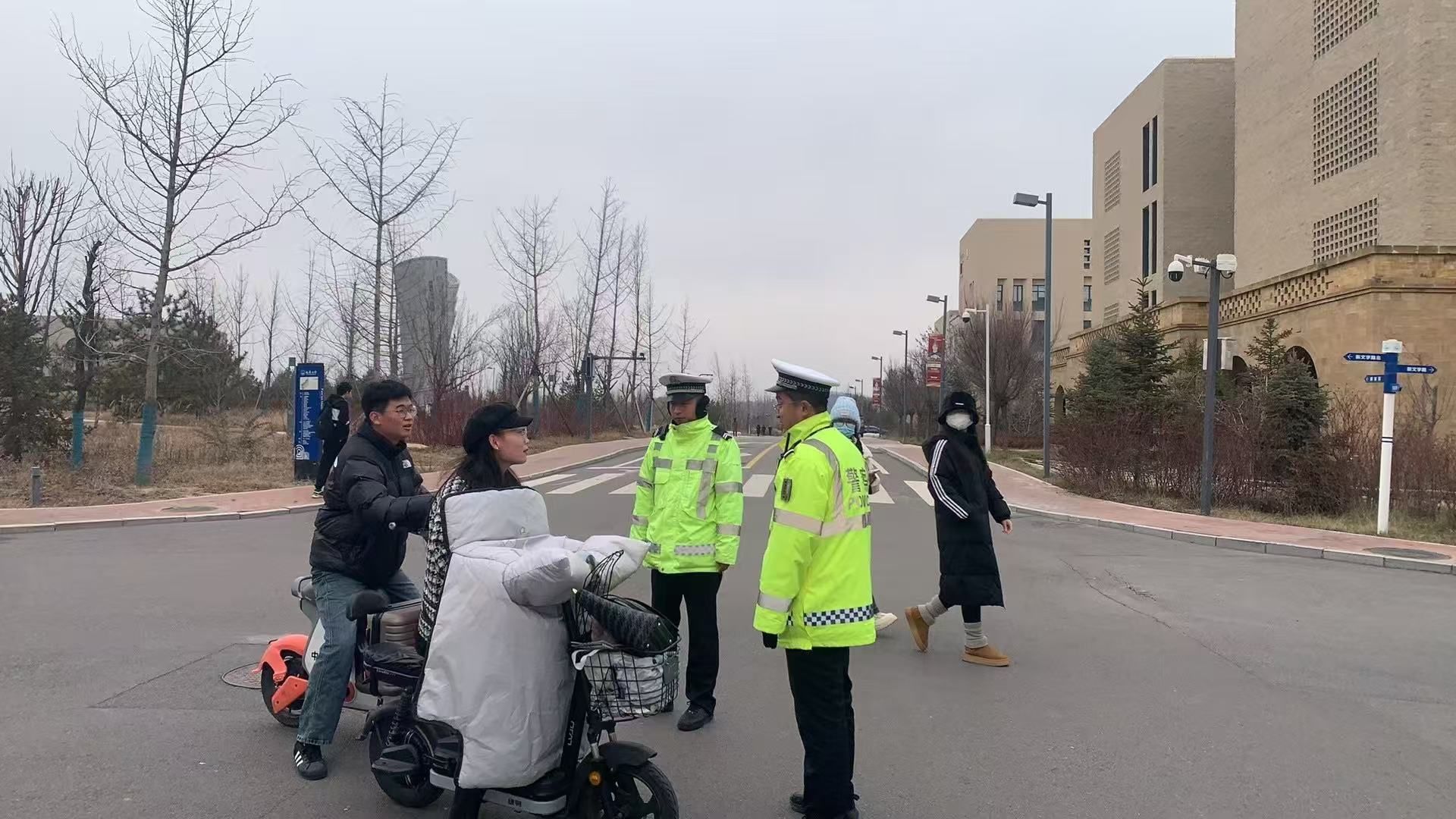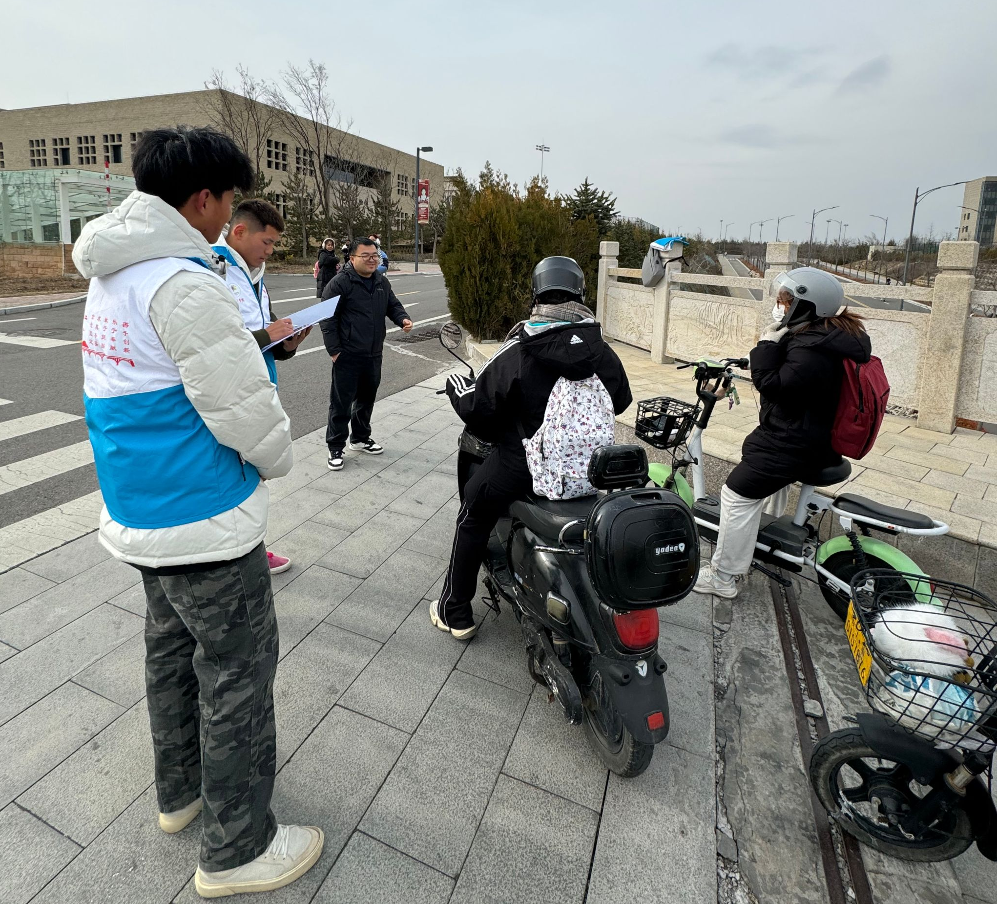 天气虽然寒冷,但全体学生干部依然顶着凌冽的寒风,身穿志愿者马甲,配合党委保卫部工作人员在行政楼天桥、南区教学楼、田径场周边区域值守,在师生就餐、上下课、上下班等车流高峰期对过往的电动车骑行者进行逐一提醒、劝阻、督促。对持有头盔而未佩戴的人员,现场开展安全教育,要求其佩戴头盔;对未购买头盔或未携带头盔人员,首次发现登记个人相关信息,并提醒配齐安全头盔后再上路骑行。全体工作人员还对校园内乱停乱放的自行车和电动车进行了规范整理。