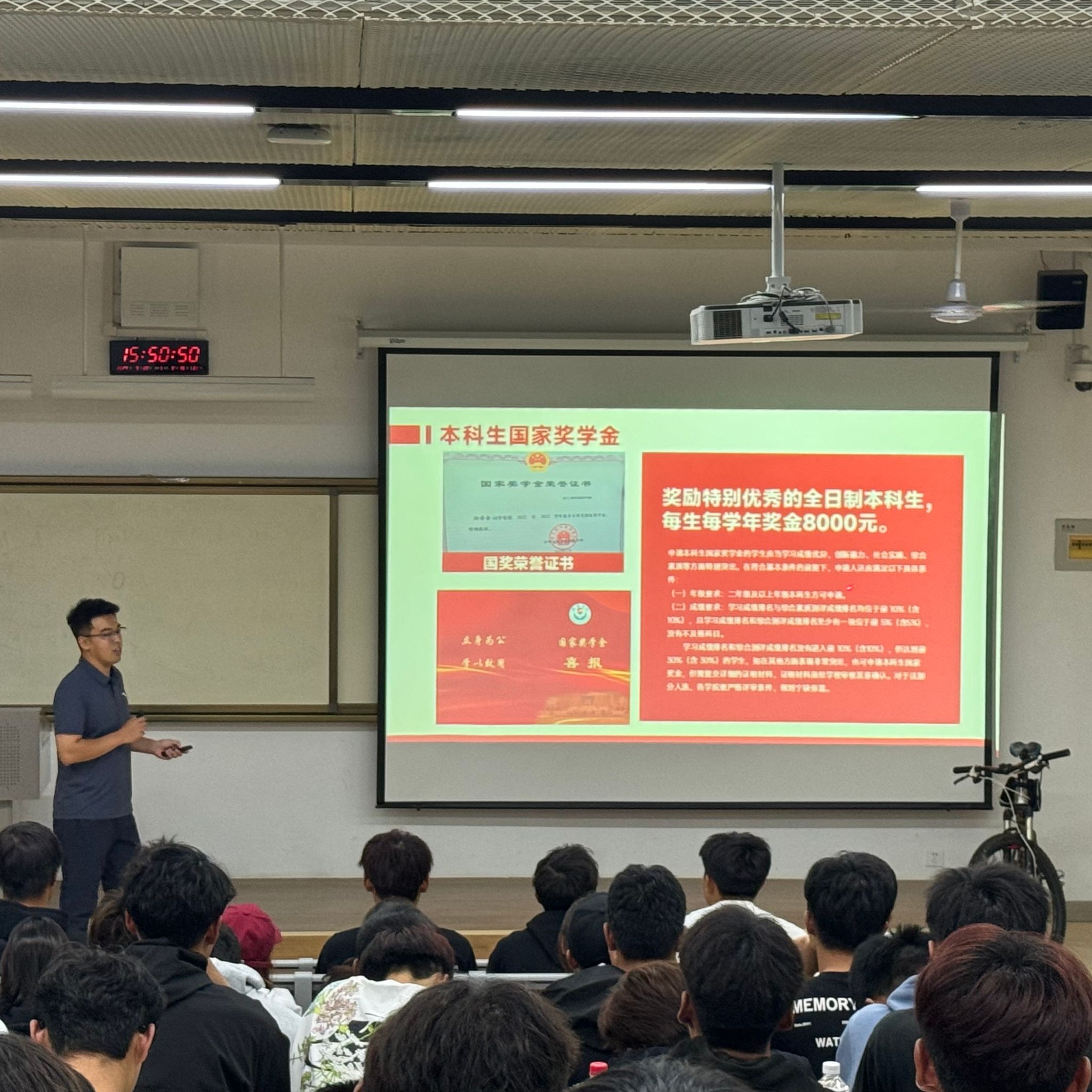 二是学工干部宣讲政策,及时为新生解答疑难困惑。班主任马滔老师结合专业特点对体育类国家职业资格证书认定政策;组织员李才才对发展党员工作流程进行了讲解;团委书记蔡佳介绍了大学生应征入伍政策和共青团工作;辅导员王海泉对奖助学金政策和综合测评办法进行了解读。