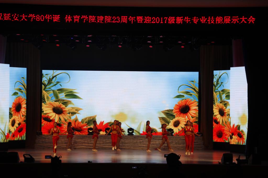 典礼结束后迎2017级新生专业技能展示大会拉开帷幕。本次专业技能展示大会从8月20日开始筹备,学院领导高度重视,多次召开专业技能展示工作会议,对展示项目的筛选、指导老师的确定、训练场地的安排及训练进展做了明确的指示与要求。各位指导老师接到表演任务后认真负责,积极组织学生开展训练。专业技能展示大会共有14个表演节目,涉及了体操、健美操、体育舞蹈、武术、跆拳道、散打、健身健美、安塞腰鼓、陕北秧歌等9个项目门类,此外优秀校友杨志伟为体院校友及全体师生献上歌曲。在各位指导老师的带领下,各个项目优秀学生共有140人次参与了此次专业技能展示。本次技能展示不仅是学院师生教学训练成果的展示平台,也是新生入学教育的重要环节,在老师,学长学姐的激励下,2017级新生必能树立正确的目标,阔步前行,获得全面的发展。