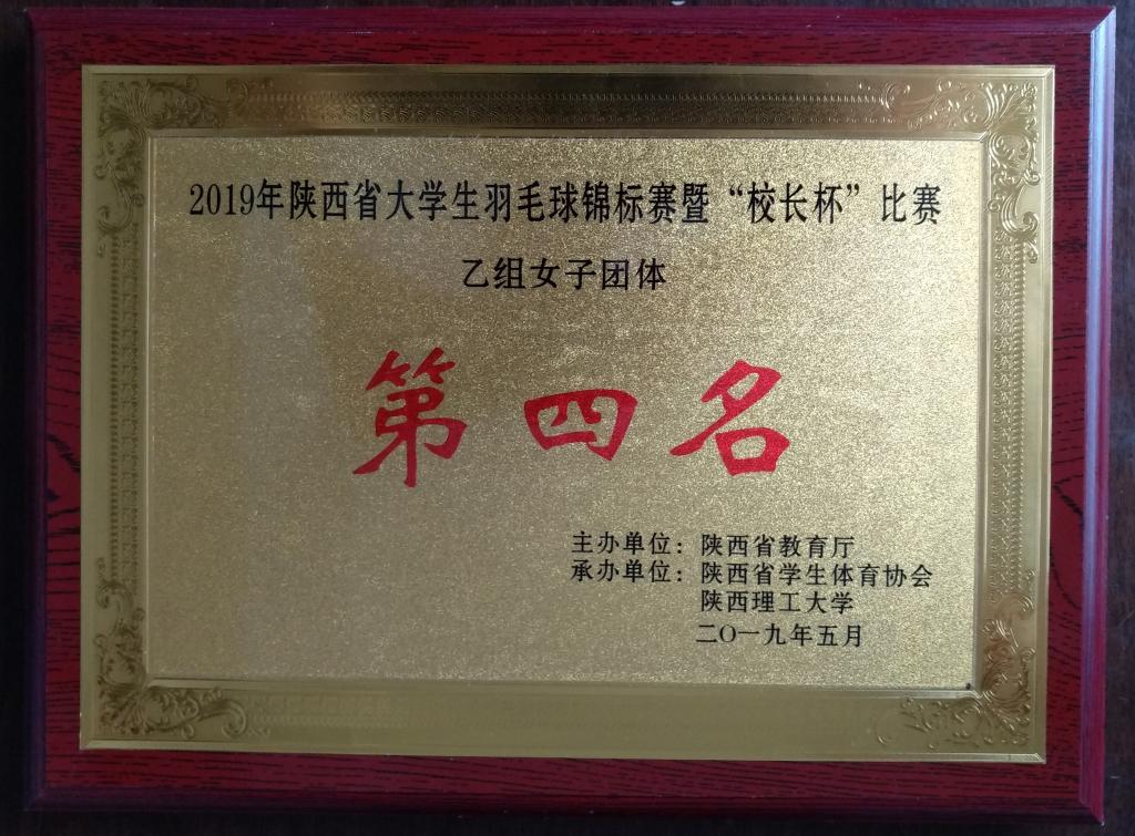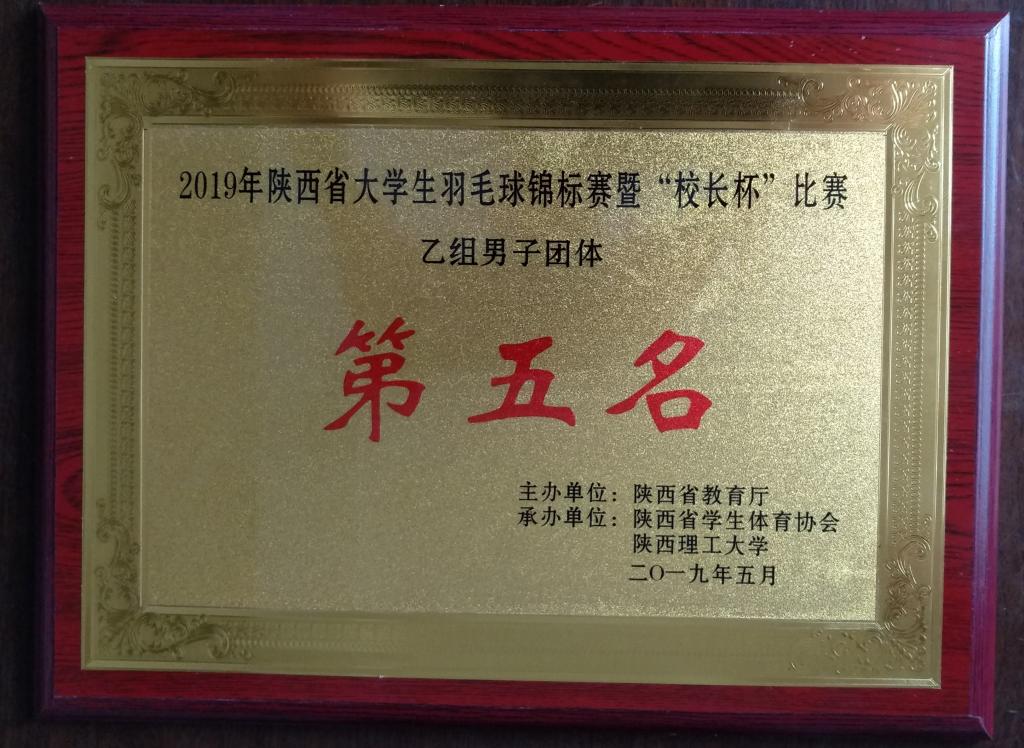 5月27日至6月1日,由陕西省教育厅主办、陕西省学生体育协会主办的2019年陕西省大学生羽毛球锦标赛暨“校长杯”羽毛球赛在陕西理工大学举行,来自全省56所高校近900余名运动员参加本次比赛。比赛分为学生甲、乙、丙组和校长甲、乙组,竞赛项目设学生男子团体、女子团体、男单、女单、男双、混双和校长杯双打赛。