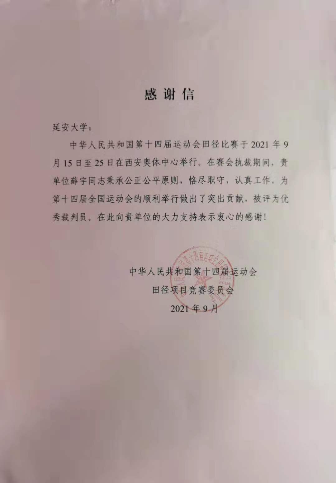 9月20日-26日,公海5500线路检测薛宇副教授受中华人民共和国第十四届运动会田径竞赛委员会邀请,参与田径比赛场地和马拉松比赛的执裁工作,获得“优秀裁判员”称号,载誉归来。随着十四运田径比赛的落幕,学校收到来自十四运田径竞赛委员会的一封感谢信,这既是对薛宇老师执裁能力的认可,也是对公海5500线路检测教师专业风采的一次展现。薛宇现为国家级田径裁判员,陕西省田径协会裁判员委员会委员,近年来多次参加国家级、省级田径比赛的执裁工作。