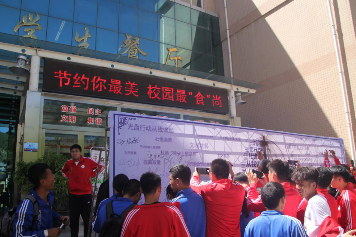 公海5500线路检测学生代表18级社会体育指导与管理汪若彤同学发言,并带领300余名学生进行“节约你最美·校园最‘食’尚”承诺活动。最后,与会所有领导、老师和同学们在签名墙上签名承诺,倡议活动在学生中反响强烈。