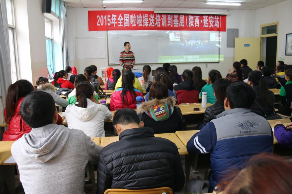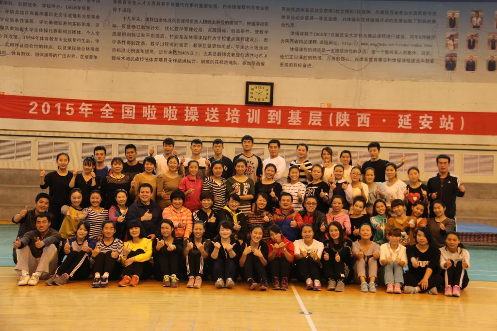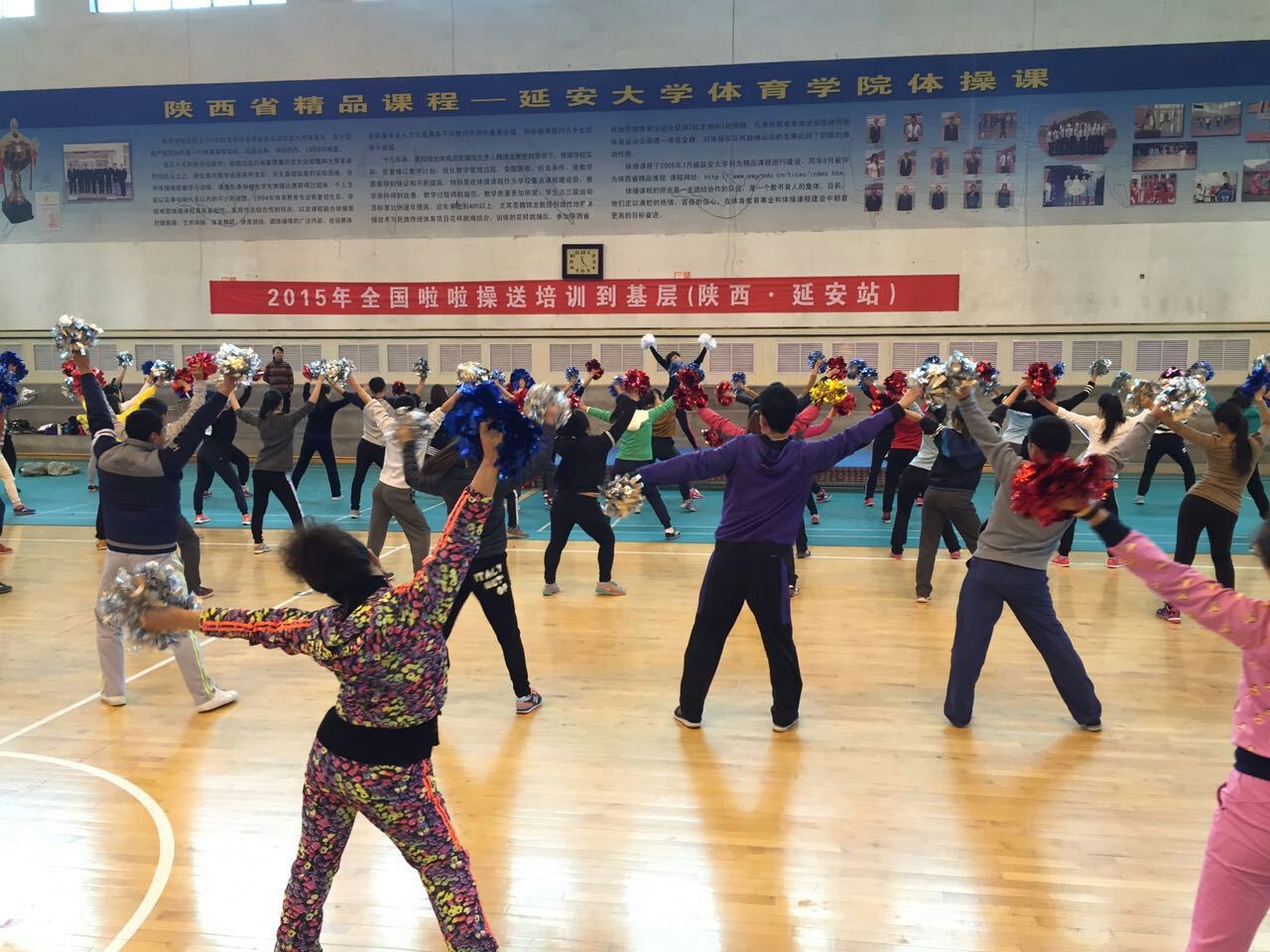 由陕西省体操协会、陕西省啦啦操委员会主办,延安市体育局、延安市啦啦操委员会和我校承办的2015年全国啦啦操送培训到基层(陕西.延安站)培训班于11月14日至15日在我校举行。陕西省啦啦操委员会选派3名优秀导师对此次培训进行授课和指导,共有来自延安市大、中、小学教师和学生及啦啦操爱好者50余人参加。