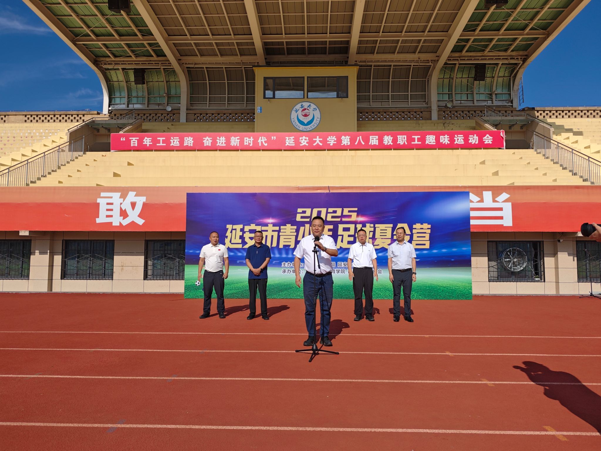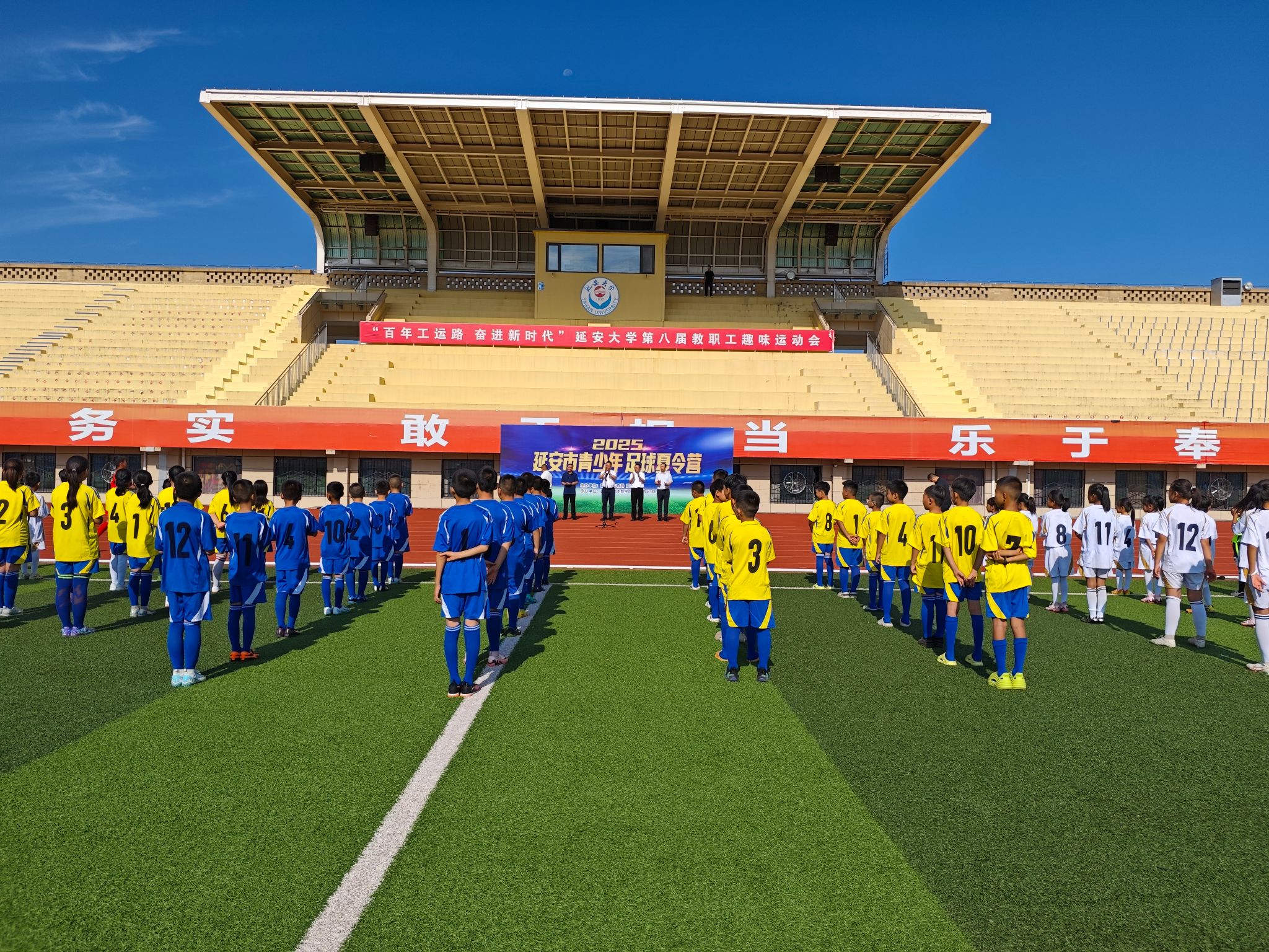 8月14日,2025年延安市首期青少年足球夏令营开营仪式在我校新城校区田径场举行,市委常委、副市长张伟,延安市体育局相关同志,公海5500线路检测党委书记兰鸿涛出席仪式。市委常委、副市长张伟宣布开营。