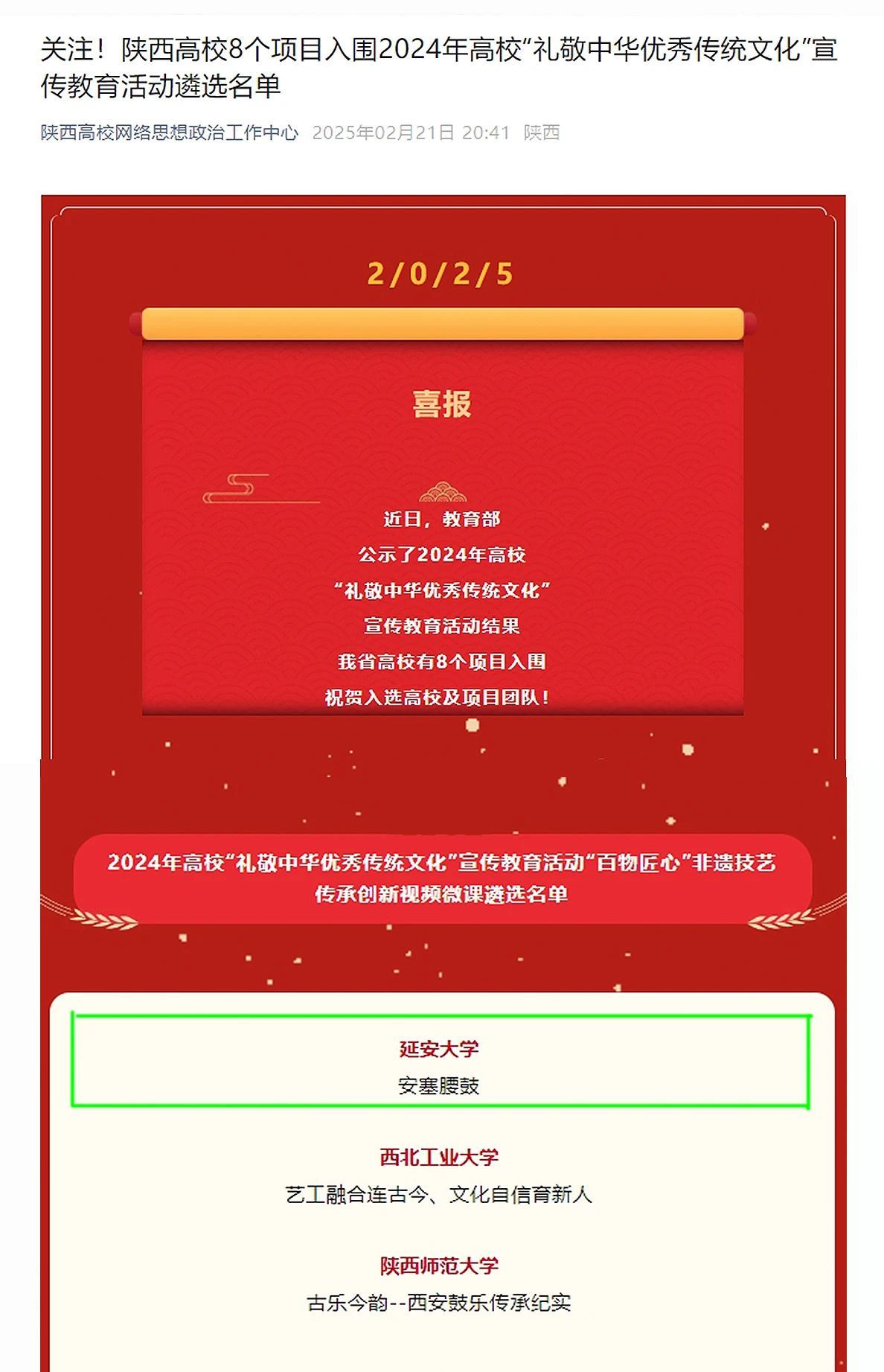 近日,教育部公布了2024年高校“礼敬中华优秀传统文化”宣传教育活动“百物匠心”非遗技艺传承创新视频微课遴选名单,公海贵宾会5500iii报送的《安塞腰鼓》视频微课成功入选。安塞腰鼓,作为第一批国家级非物质文化遗产,以其磅礴的气势、精湛的技艺和深厚的文化内涵,成为了中国民间艺术的璀璨明珠,享有“天下第一鼓”的盛誉。公海贵宾会5500iii自2000年起开设体育专业选修课程,2006年增设体育公共选修课程,2012年成为公海5500线路检测专业课程和校级精品课程,2016年成为公海贵宾会5500iii体育课程,2019年在学堂在线国家精品教学平台上线,2021年成为研究生教育教学改革项目,2022年成为公海贵宾会5500iii继续教育教学改革课程思政样板课项目,2023年获批为陕西省特色线上课程,2024年获批为陕西省线上一流课程,2025年被列为陕西省普通高校中华优秀传统文化传承项目。