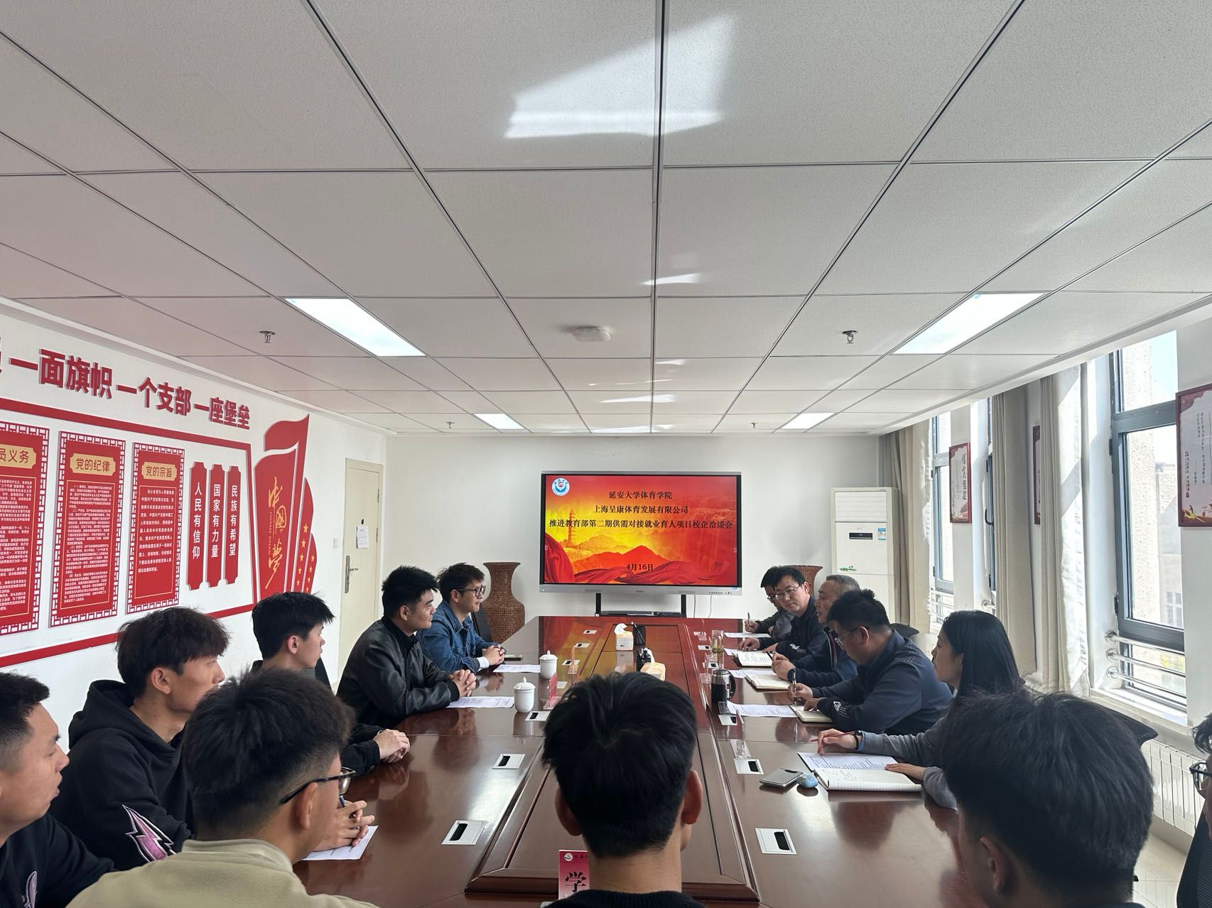 4月16日上午,上海呈康体育发展有限公司与公海5500线路检测校企合作洽谈会在学院党员活动室举行,上海呈康体育发展有限公司联合创始人杨洋、校企部经理李迎超,公海5500线路检测院长宗有智、副院长张应龙、辅导员以及学生代表参加会议,会议由学院党委副书记徐海阔主持。